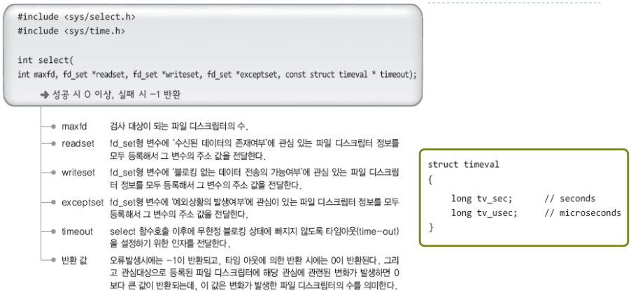 - FD_ISSET(int fd, fd_set *fdset); : 해당 파일디스크립터 fd가 0인지 확인 (정보가 있으면 양수 반환)