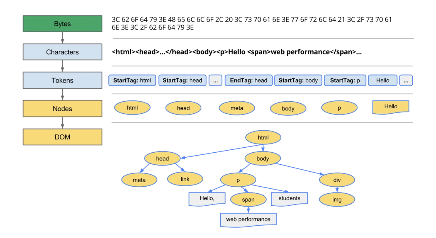 먼저, HTML 코드가 DOM 트리로 변환된다, 브라우저는 다음과 같이 마크업을 처리한다