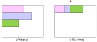 - 인라인 요소: 요소를 표시한 후에도 줄바꿈이 일어나지 않음 => <a>, <img>, <input> 등