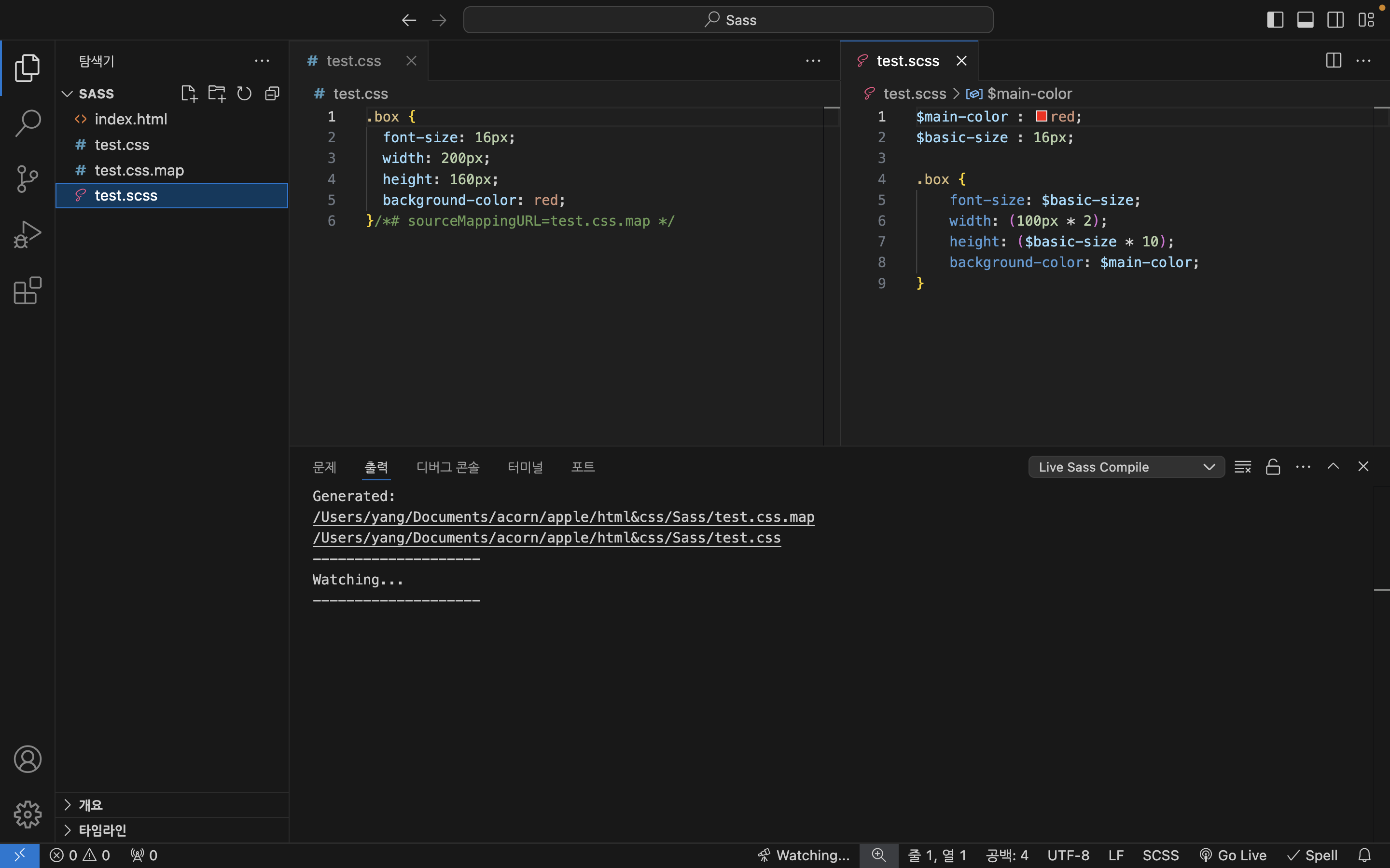 SCSS는 Sass의 3버전에서 나온 css 구묵과 완전히 호환되도록 만든 Sass의 모든 기능을 지원하는 상위집합이다 그래서 말만 다르지 둘은 같다(거의?) 둘이 문법이 살짝? 다른 것들이 있을뿐.. 가장 큰 차이는 중괄호와 세미콜론의 차이이다 (아래 사진 왼쪽이 SCSS, 오른쪽이 Sass) 이처럼 살짝 문법이 다른부분이 있다 Sass: 좀 더 간결하며 코드가 깔끔해짐 SCSS: 한줄작성이 가능하며 css와 유사한 문법이기 때문에 코드 통합이 쉽다 취향차이이지만 보통 SCSS를 많이 사용하긴한다